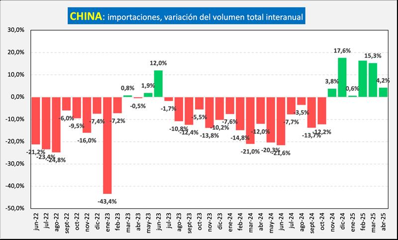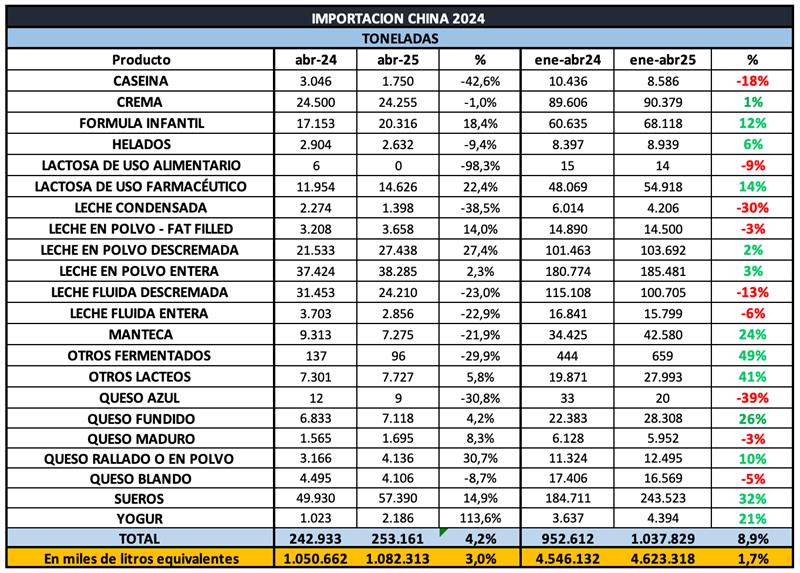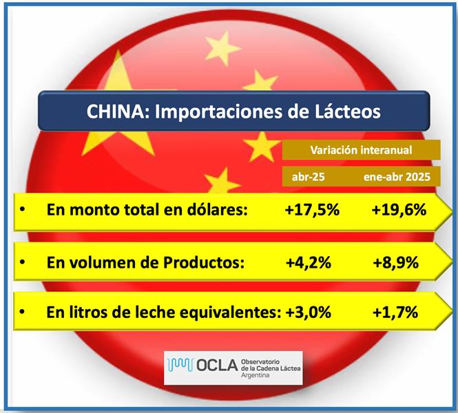 CHINA: importaciones de productos lácteos a abril de 2025 26/5/2025![]() Las importaciones de productos lácteos de China venían creciendo significativamente entre 2013-2021 (salvo en la crisis de 2015) a una tasa acumulativa del 10,6% anual, con la caída del 16,5% en 2022, del 10,0% en 2023 y del 9,9% en 2024, la tasa se redujo al 3,8% anual. De cualquier manera, sigue siendo China uno de los principales motores de la demanda de lácteos en el mercado internacional, punto este que varios analistas ponen en duda para el futuro. ![]() Las compras de China en el mercado internacional ascendieron a unos 20.000 millones de litros de leche equivalentes en el año 2021, muy cercanas al 25% de lo que se comercializó en ese mercado (excluyendo las ventas intra Unión Europea), de allí que su comportamiento sea muy relevante para la determinación de los precios. En el año 2022 se dio una caída del 17,1% en las ventas mundiales en China. Si vemos lo que ocurrió en el año 2023, las compras de China medidas en litros de leche equivalentes cayeron un 20,5% (las compras chinas representaron el 14% del mercado mundial), y en 2024 cayeron el 11,0%. Esta menor demanda cuando se enfrenta con una oferta creciente en producción de leche, produce reducciones en los precios internacionales. En los últimos tiempos esta menor demanda de China se viene compensando con un importante crecimiento de la demanda en países del Sudeste Asiático. Estas bajas en las compras de China respondieron en principio, a altos stocks generados en las grandes compras de 2021, a las dificultades logísticas que implicaron el cierre de algunas ciudades por rebrotes de Covid, efectos colaterales de la Guerra en Ucrania y el proceso inflacionario que se viene dando en todas las economías mundiales con incidencias recesivas en la demanda. Luego la baja se profundizó por una mayor producción local con incentivos del gobierno para incrementarla y reducir la reconstitución de leche importada. En 2025, la situación de demanda se revierte y se da un crecimiento en el primer cuatrimestre del año del 8,9% en el volumen importado y recuperando a niveles de 2023. ![]() Puede observarse en el gráfico superior la tendencia al crecimiento de la producción de productos elaborados en los últimos 15 años, con una estabilización entre 2021-2023 y una importante caída en 2024 (-5,3%), que continúa en 2025. ![]() Por su parte la tasa de autosuficiencia, que surge de comparar la producción total local con la oferta local (todo medido en litros de leche equivalentes), estuvo en 2024 en un 85% (la más alta de los últimos 10 años), demostrando el déficit estructural de abastecimiento de leche, pero que se viene reduciendo. ![]() En el mes de abril, se da una suba del 4,2% en el volumen de importaciones, con subas generalizada de productos, salvo productos de menor relevancia en volumen, siendo los determinantes del aumento leche en polvo y sueros. El acumulado del primer cuatrimestre del año presenta una suba del 8,9%. ![]() El monto total de importaciones en dólares del período enero-abril del año fue un 19,6% superior a igual período del año anterior y el importe promedio pasó de US$ 4.033/ton. a US$ 4.428/ton., un 9,8% más, por lo que la suba en el monto total importado fue atribuible en casi similares proporciones entre volumen y precio. El Valor por Litro de Leche Equivalente de las importaciones de China en el primer cuatrimestre de 2025 fue de US$ 0,994 (subiendo un 17,6%), cuando el Valor por Litro Equivalente de las exportaciones totales de Argentina a todos los destinos para igual período, fue de US$ 0,56/litro. En el gráfico siguiente se pueden observar las tasas de variación de las importaciones de productos lácteos de China, con caídas importantes en 2022 y principios de 2023, producto de los factores mencionados más arriba, y la tasa levemente positiva de marzo 2023, que vuelve a tornarse levemente negativa en abril y se comienza a recuperar en mayo de 2023 y con mucha mayor fuerza en junio, pero desde allí a octubre, con diferente intensidad, la tasa de variación interanual de las importaciones permanece siempre en el cuadrante negativo (16 meses), tornándose positiva en los últimos seis meses. ![]() China es el principal importador de Leche en Polvo Entera y su principal proveedor es Nueva Zelanda quien ostentó el 93,1% de participación de ese producto en el gigante asiático en lo que va de 2025, levemente superior a la participación de igual período del 2024 que fue del 91,3%. ![]() ![]() Informe GAIN Lácteos - República Popular de China Preparado por: Personal del Servicio Agrícola Exterior de China y Jadon Marianetti Se pronostica que la producción de leche cruda en China disminuirá en 2025 debido a la continua reducción del tamaño del rodeo lechero, a pesar de la mejora del rendimiento por vaca. Se prevé que las importaciones de leche fluida y leche descremada en polvo disminuyan debido a la relativamente alta producción nacional y la débil demanda. Se pronostica que las importaciones de leche en polvo entera aumentarán ligeramente debido a la reducción de la producción nacional. Se espera que las importaciones de queso aumenten moderadamente debido a la mayor demanda en el sector de la restauración. Las importaciones de manteca aumentarán debido al crecimiento en los sectores de la panadería y los restaurantes, aunque la producción nacional también está en expansión. Se prevé que las importaciones de suero disminuyan debido a los altos aranceles sobre el producto estadounidense y la limitada capacidad de los proveedores alternativos, a pesar de la firme demanda en los sectores de piensos y fórmulas infantiles. elaborado por el OCLA sobre la base de información que publica Aduana de China, CLAL.it y GAIN Report.