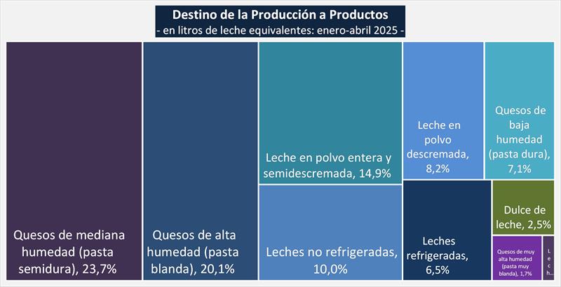 Por último, en el gráfico de abajo vemos la distribución porcentual a cada producto en litros de leche equivalentes para el primer cuatrimestre de 2025, quesos 53%, leches en polvo 23%, leches fluidas 17% y resto de productos el 7%.