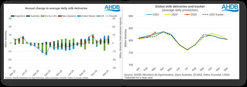 Las entregas diarias en el Reino Unido promediaron 44,2 millones de litros diarios en marzo, un 3,8 % más que el año pasado, lo que equivale a 1,6 millones de litros diarios adicionales. El clima favorable y la situación económica de los productores lácteos impulsaron la producción en el período previo a la descarga de primavera.
