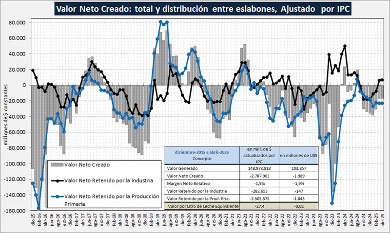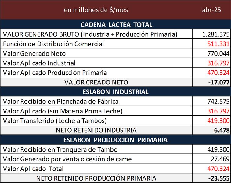La cadena presenta un resultado negativo en abril de 2025 de $ 17.078 millones (1,85 centavos de dólar por litro de leche equivalente). El sector industrial tiene un resultado estimado positivo de $ 6.478 millones (US$ 5,8 M) y el sector primario tiene un resultado negativo de $ 23.555 millones.