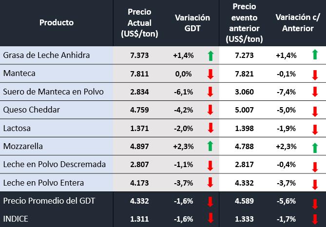 -GDT Price Index indica el promedio del cambio porcentual en los precios para cada especificación, ponderado por la cantidad de cada especificación vendida. GDT proporciona un cambio en el índice de precios de GDT del evento anterior para todos los productos, además de un equivalente para cada grupo de productos y cada combinación de grupo de productos/período de contrato. El índice de precios proporciona un reflejo más preciso de los movimientos de precios entre los eventos comerciales.