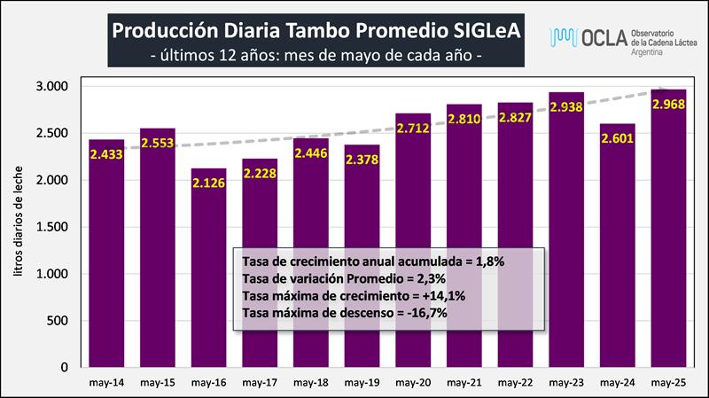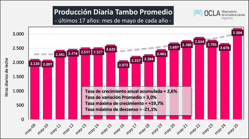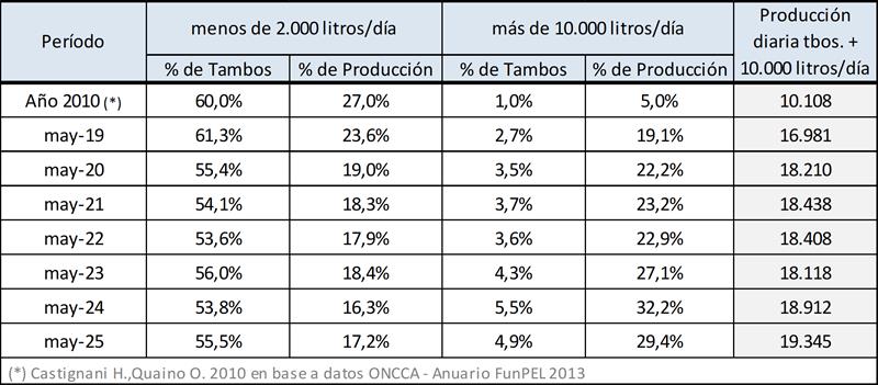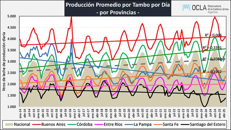 Estructura de la producción primaria – mayo 2025 16/6/2025![]() Estratificación de Tambos En el cuadro se presenta la participación de los tambos en función a su tamaño medido en litros de leche diarios del mes de mayo de 2025 sobre la base SIGLeA - LUME: ![]() Puede observarse que los 440 tambos del estrato de + de 10.000 litros de producción diaria, produjeron durante el mes de mayo un promedio de 19.345 litros diarios, representaron el 4,9% del total de tambos y aportaron un 29,4% de la producción total. Esto es bastante más de lo que aportaron los 5.000 tambos de menos de 2.000 litros diarios y que fueron el 55,5% de los tambos totales, que representaron el 17,2% de la producción nacional. ![]() Concentración en unidades productivas más grandes Puede verse en el cuadro siguiente al comparar con datos disponibles del año 2010, que en un extremo viene disminuyendo la participación tanto en cantidad de tambos como en el volumen de producción de las unidades productivas de menos de 2.000 litros diarios y en el otro extremo de la estratificación, se incrementa la participación de las unidades de más de 10.000 litros diarios. Entre 2010 y 2025 los tambos de menos de 2.000 litros de producción diaria venían reduciendo significativamente su importancia relativa en la producción de leche total y los tambos de más de 10.000 litros diarios de producción, multiplicaron por casi 6 su participación en la producción, a pesar del efecto de caída de la producción total que se dio en 2024. ![]() Como mencionamos arriba, se están reduciendo la cantidad de tambos como lo venimos indicando desde el inicio de nuestras publicaciones, y en base a la información disponible podemos deducir que la mayor reducción no se da mayoritariamente en los tambos más chicos (con una característica mayor de producción familiar y ubicados muchos de ellos en cuencas no tradicionales), sino en aquellos que superaron un volumen de 2.000 litros diarios, pero no llegan a convertirse en tambos de mayor escala por diferentes motivos: sucesión familiar, superficie, acceso al financiamiento, incorporación de tecnologías de insumos y procesos, etc. Por su parte, en el gráfico siguientes se puede ver la distribución de los tambos por provincia en base a su tamaño, y se puede concluir que los tambos más grandes están principalmente en Buenos Aires, seguido por Córdoba y el resto de provincia se caracteriza por una prevalencia de tambos de menos de 3.000 litros diarios. ![]() El Tambo Promedio Mensual Sobre la base de la producción mensual y la cantidad de tambos que indica el Tablero Dinámico de SENASA, podemos inferir el tamaño del tambo promedio, unos 3.204 litros de leche diarios para mayo de 2025, una producción superior al año anterior (+19,7%). En el período 2016-2025 el tambo promedio creció a una tasa del 5,0% anual, situación que se vio interrumpida en 2024 por diferentes factores. ![]() La serie de cantidad anual de tambos y el tablero dinámico, ambos de SENASA, utilizados para los cálculos de la producción por tambo, es la única disponible y a pesar de conocer algunas falencias en el relevamiento de la información, el criterio se mantiene en el tiempo y nos permite evaluar la tendencia. En caso de existir una fuente de información mejor, obviamente no proveniente de estimaciones o supuestos, la incorporaremos en nuestro análisis. El Tambo Promedio SIGLeA – LUME, producción diaria al mes de mayo de cada año: ![]() En el gráfico de arriba se compara la evolución del tambo promedio mensual que se publica con la información surgida del SIGLeA – LUME en el Tablero de Comando Sectorial 2° Parte El Tambo Promedio por Provincia SIGLeA – LUME, producción diaria últimos 12 meses ![]() La producción promedio diaria por tambo y por provincia que graficamos aquí es la que arrojan los datos de SIGLeA – LUME y se toma el promedio de los últimos 12 meses (junio/24 – mayo/25). Los datos SIGLeA – LUME del último mes provienen de 7.595 liquidaciones, 380 industrias lácteas. Por último, en el gráfico de abajo se muestra la tendencia en la evolución del tambo promedio nacional y por provincia, donde hay provincias como Córdoba con una importante tendencia al crecimiento (mayo R cuadrado), en la producción de sus unidades productivas, seguida por Santa Fe y Buenos Aires, y luego el resto con una tendencia estable y un solo caso negativa. ![]() Todos estos gráficos y más en: https://www.ocla.org.ar/contents/newschart/portfolio/?categoryid=17 elaborado por el OCLA sobre información de la DNL-SAGyP y SENASA