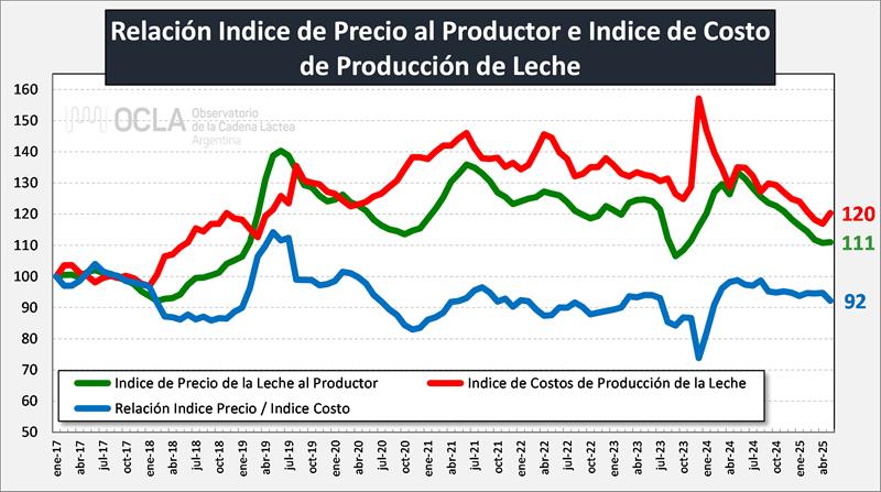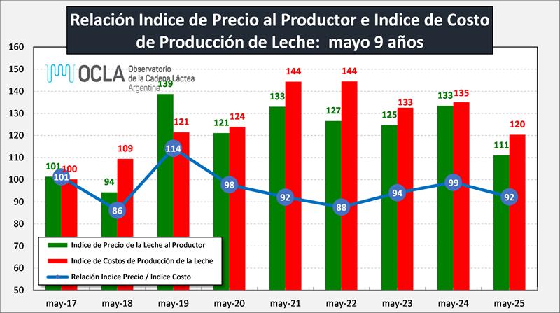 En mayo de 2025 se mantiene el índice precio y sube el índice costo lo que hace caer la relación a un valor 92, -2,6% respecto al mes anterior, en el interanual cae 6,6%. En el acumulado de los primeros cinco meses del año hay una mejora del 0,8% respecto a igual período del año anterior. Como ya lo indicamos en el informe de costos, los precios se vienen ajustando por debajo de la inflación, pero una situación similar viene ocurriendo con los principales costos, lo cual mantiene favorables aún las relaciones de precios. De continuar esta leve pero consecutiva desmejora de los precios respecto a los costos, las relaciones pueden comenzar a tornarse desfavorables. Es muy importante que siga recuperándose el consumo doméstico y que mejore la situación cambiaria en el mercado de exportación, sobre todo dado el crecimiento de la producción en términos interanuales y la ida hacia el pico de máxima producción (octubre).