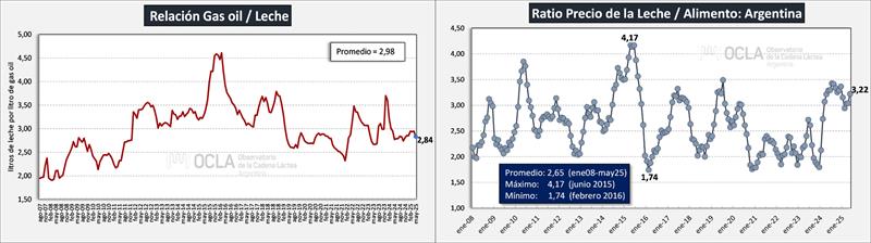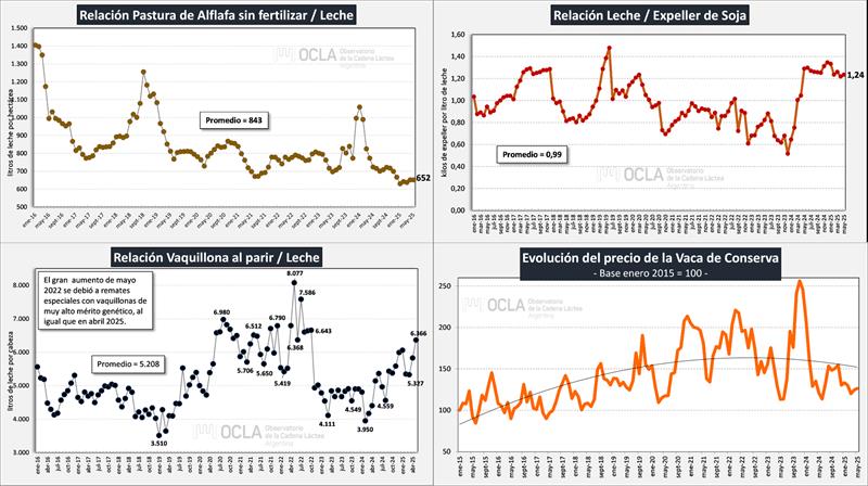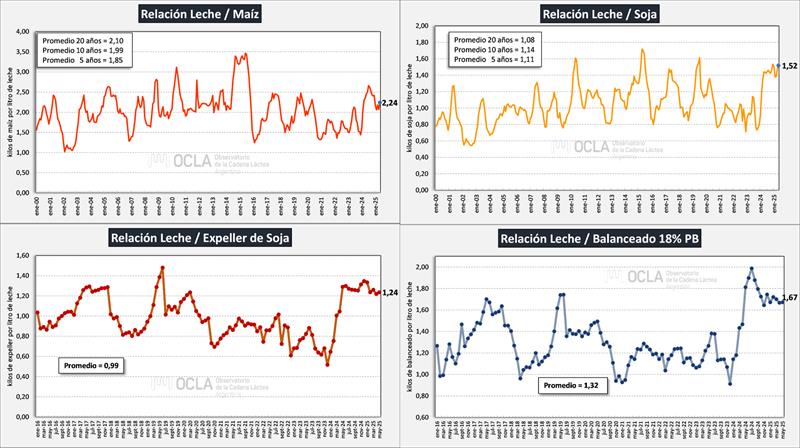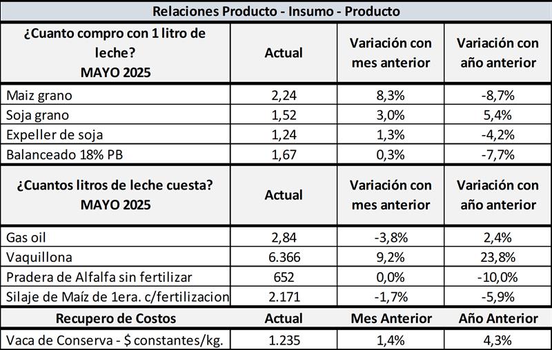 En su mayoría las relaciones de precios entre la leche y los principales insumos utilizados en la producción, se vienen deteriorando debido a que el ajuste de precios de la leche al productor, en los últimos meses está por debajo de los índices inflacionarios. A pesar de ello los indicadores todavía son favorables, es decir, mejores que las medias históricas y las referencias habituales.