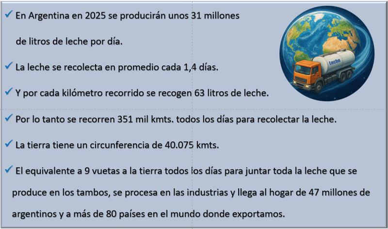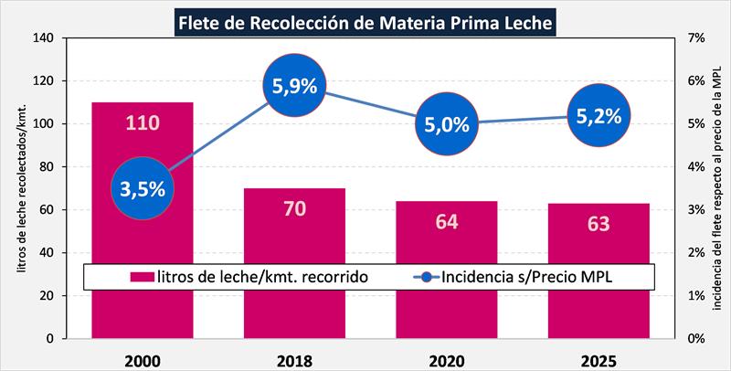 El flete de recolección de leche que va desde el tambo hacia el recibo de la industria ha tenido una variación significativa en los últimos 20 años. A fines de los años 90 y principios de los 2000 se recolectaban 110 litros de leche por kilómetro recorrido y dicho costo representaba en promedio el 3,5% del precio de la leche pagada al productor.