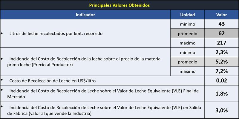 En el cuadro se observan los promedios y valores extremos de los litros de leche recolectados por kilómetro recorrido como la incidencia relativa que tiene el costo de recolección de leche respecto al costo de la materia prima leche (precio pagado al productor). Además, se puede ver la incidencia porcentual del costo de recolección sobre el valor final de litro de leche equivalente que paga el consumidor final y respecto al valor que logra la industria por sus productos (valor de salida de fábrica).