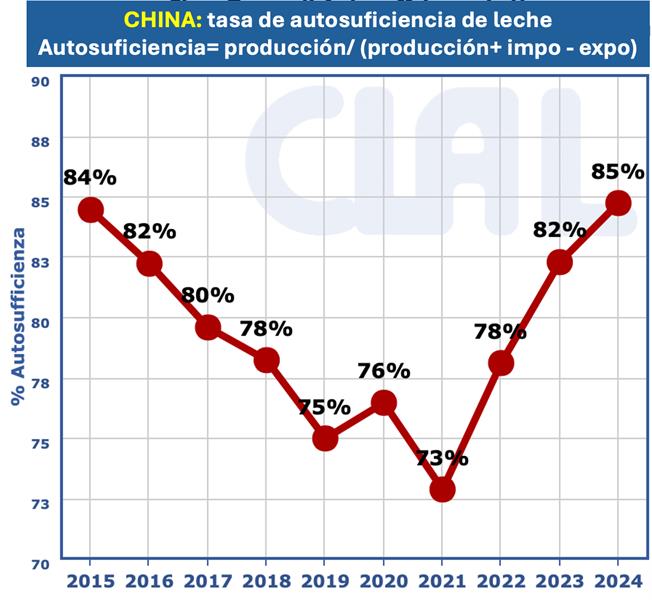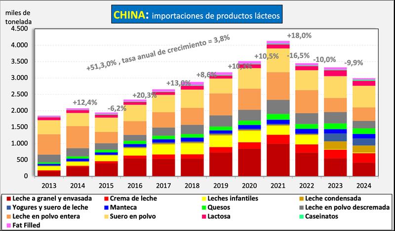 Las importaciones de productos lácteos de China venían creciendo significativamente entre 2013-2021 (salvo en la crisis de 2015) a una tasa acumulativa del 10,6% anual, con la caída del 16,5% en 2022, del 10,0% en 2023 y del 9,9% en 2024, la tasa se redujo al 3,8% anual. De cualquier manera, sigue siendo China uno de los principales motores de la demanda de lácteos en el mercado internacional, punto este que varios analistas ponen en duda para el futuro.