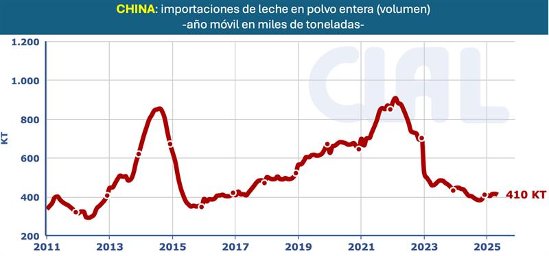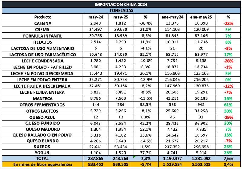 CHINA: importaciones de productos lácteos a mayo de 2025 25/6/2025