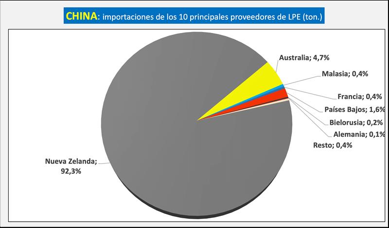 China es el principal importador de Leche en Polvo Entera y su principal proveedor es Nueva Zelanda quien ostentó el 92,3% de participación de ese producto en el gigante asiático en lo que va de 2025, levemente superior a la participación de igual período del 2024 que fue del 90,6%.