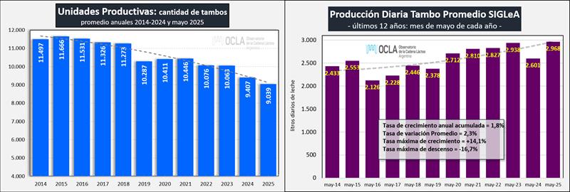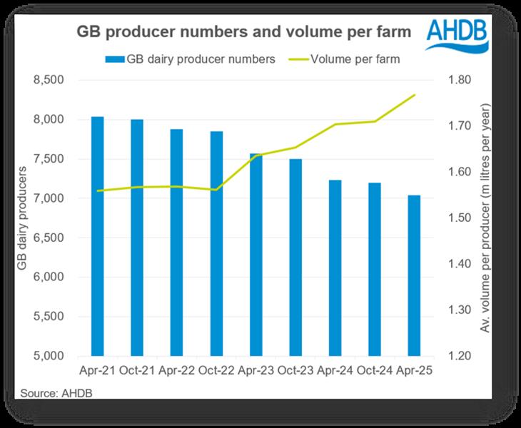 A pesar de la disminución en el número de productores, el volumen promedio de leche por granja en Gran Bretaña ha aumentado hasta aproximadamente 1,77 millones de litros por granja durante el año, de abril de 2024 a abril de 2025.