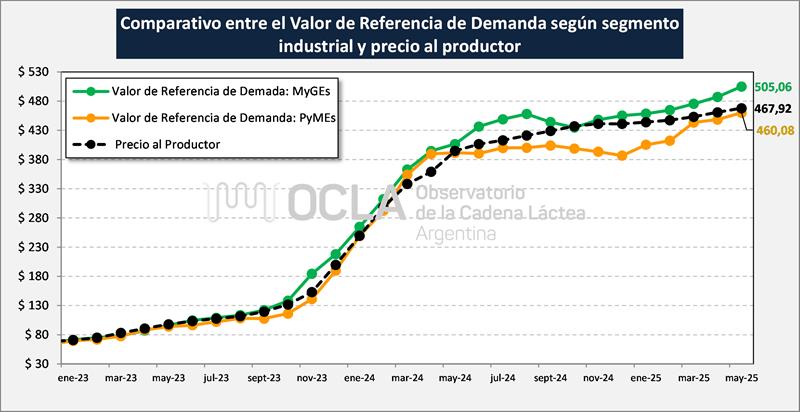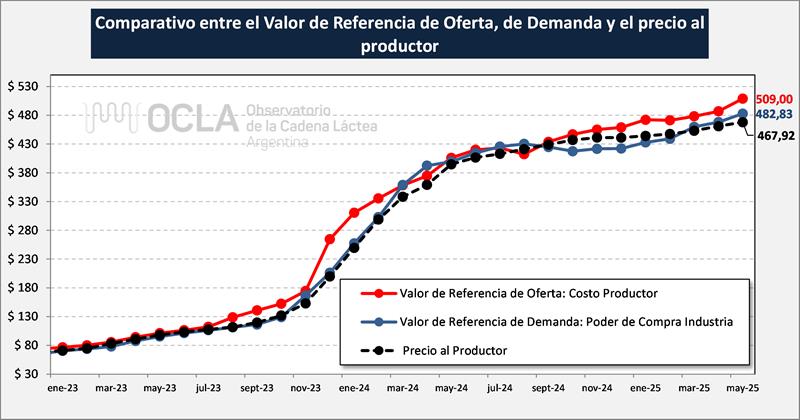 En el mes de mayo de 2025 la capacidad de pago según IAPUCo llegó a $ 482,83/litro de leche y fue $ 14,91/litro, superior al precio real pagado que fue para ese mes de $ 467,92. No se incluyen Notas de Crédito, ni los pagos por fuera de la liquidación formal que también son precio y obviamente las estadísticas no pueden capturar. También se puede observar en el gráfico superior que el Valor de Referencia de Demanda o Costo de Largo Plazo del Productor estuvo en mayo 2025 en $ 509,00 ($ 41,08 por encima del precio percibido) y que la brecha que se venía reduciendo en el primer cuatrimestre del año, se amplió en el último mes disponible.