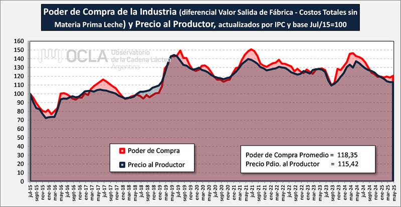 Viendo el precio real liquidado al productor y comparado con la capacidad de pago promedio de la industria, actualizada por IPC y llevado a base julio 2015 = 100, para un período más prolongado, puede observarse que en el largo plazo (salvo oscilaciones temporales) los valores promedio convergen: Indice 115,42 por litro de Precio al Productor e Indice 118,35 por litro de Poder de Compra, con un cierto distanciamiento en el período nov23-ago24 a favor de los poderes de compra, y equiparándose ambos índices entre sep24-feb25 y volviendo a ser superiores los poderes de compra en marzo-mayo próximos pasados.