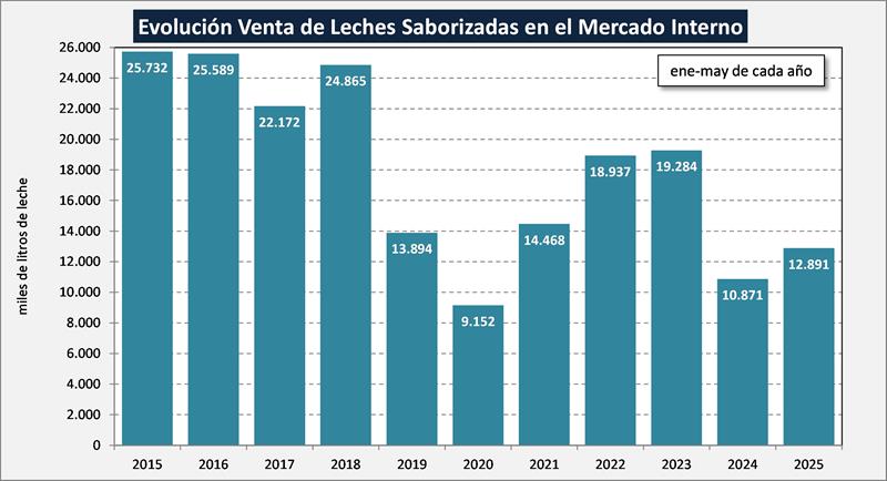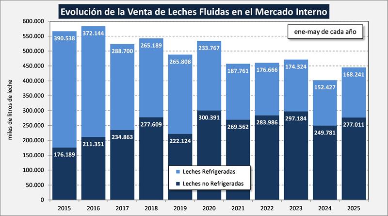 La comparación interanual (may/25 vs may/24) indicó un incremento del 4,8% en volumen de productos y una suba del 2,7% en litros de leche equivalentes. Ya se venía marcando en los últimos meses una importante desaceleración en la caída interanual del primer semestre de 2024, y se consolidó la recuperación en el acumulado del año 2024 y en estos primeros cinco meses de 2025.