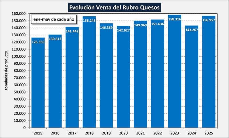 Para los quesos, el principal rubro de destino de elaboración y comercialización de productos, se da una situación de mayor estabilidad y una notable recuperación en el período enero-mayo de 2025, donde las ventas son prácticamente iguales a la de los primeros cinco meses de 2023. Se prioriza por precio, al peso (fraccionados) y con prevalencia de productos más commodities (cremoso, barra y duros “frescos”) que especialidades. Además, es dable acotar que por los exiguos resultados que genera la exportación debido al retraso cambiario, hubo mucho cambio de destino hacia el mercado interno y con precios más bajos.
