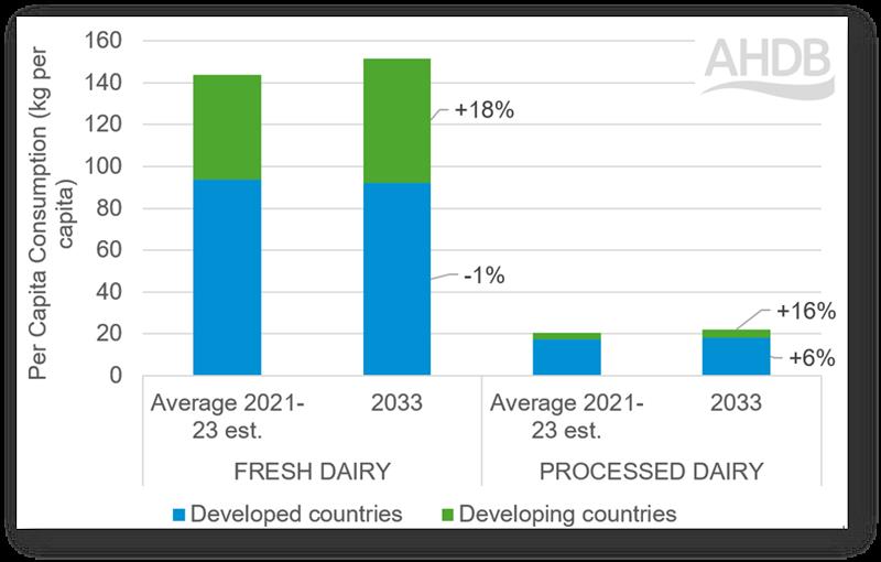 Se proyecta que el consumo per cápita de productos lácteos procesados aumente tanto en los países en desarrollo (+16%) y países desarrollados (+6%).