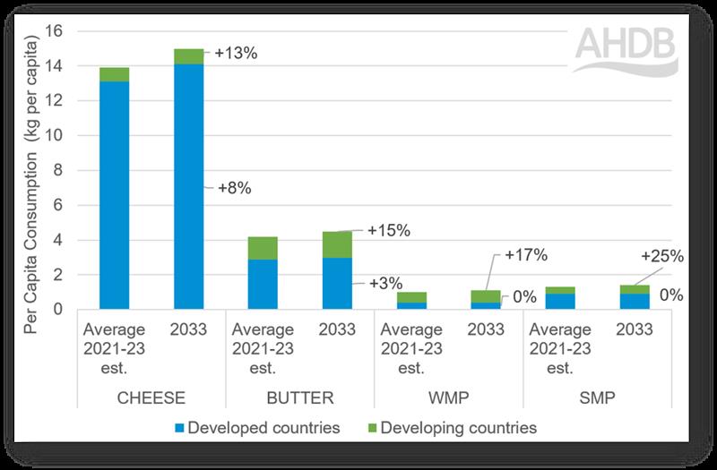 A nivel mundial, se prevé que el queso experimente el mayor crecimiento per cápita entre los productos lácteos procesados, con un 13% en los países en desarrollo y un 8% en los países desarrollados durante la próxima década. También se prevé que la manteca, la leche en polvo entera (LPE) y la leche en polvo descremada (LPD) experimenten aumentos per cápita globales significativos.