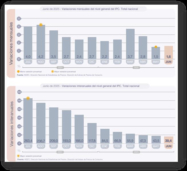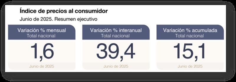 El nivel general del Índice de precios al consumidor (IPC) representativo del total de hogares del país registró en junio una variación de 1,6% con relación al mes anterior, el acumulado del primer semestre de 2025 ascendió a 15,1% y el interanual llegó al 39,4%.