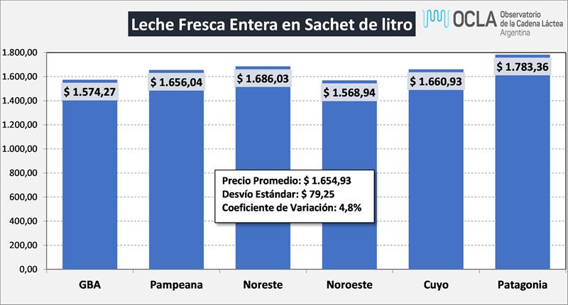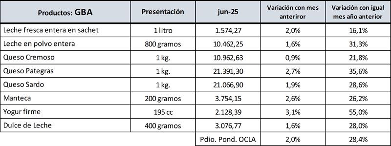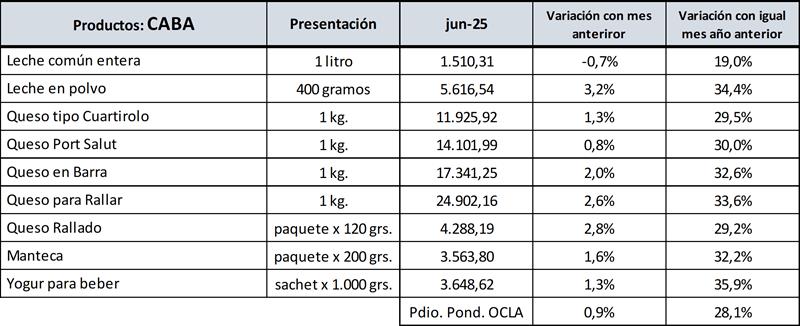 Según datos publicados por la Dirección General de Estadísticas y Censos - Ministerio de Hacienda del Gobierno de la Ciudad de Buenos Aires, los precios de los productos lácteos de esta canasta, tuvieron un crecimiento mensual promedio ponderado del 0,9%, y un incremento interanual del 28,1%. El ponderado es elaborado por OCLA sobre el mismo criterio mencionado para la canasta GBA de INDEC.