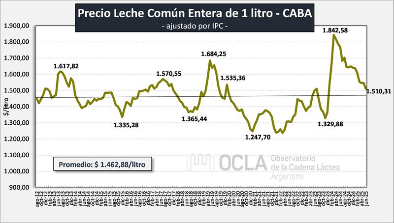 En la leche común entera de litro se observa que el precio de junio del 2025, es 2,3% inferior al mes anterior en moneda constante, - 0,7% en moneda corriente, y en el interanual está 14,7% por debajo de junio 2024 actualizado por IPC. Siguiendo en el análisis a moneda constante, el precio de junio de 2025 se ubica 3,2% por encima de la media de la serie y es 18,0% más bajo que el máximo alcanzado hasta ahora en marzo del año pasado, y a pesar de los vaivenes con una tendencia estable en los últimos 14 años.