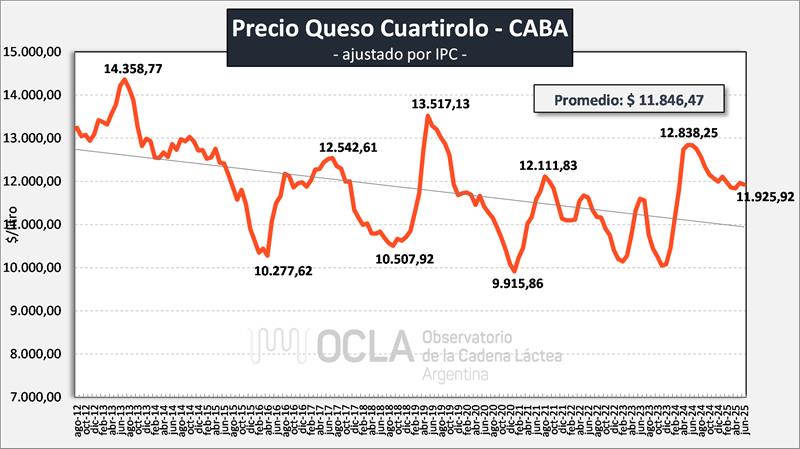 En el caso del queso cuartirolo mantiene una mayor tendencia decreciente en la serie de 14 años, lo cual indica su elevada comoditización. El precio de junio fue 0,7% superior a la media histórica disponible y estuvo 16,9% por debajo del máximo alcanzado en 2013.