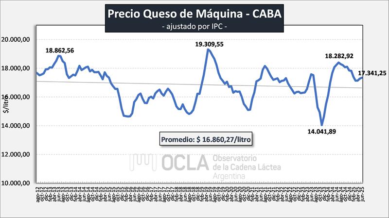 Otro commoditie de mercado doméstico como el queso barra o de máquina presenta un valor 0,4% superior al mes anterior, -4,9% respecto a igual mes del año anterior, ambos en moneda constante, con leve tendencia de caída tanto en el largo plazo como también en los últimos 8 meses, ahora estos últimos meses con leve recuperación. El precio de junio 2025 es un 2,9% superior al promedio histórico disponible en esta serie.