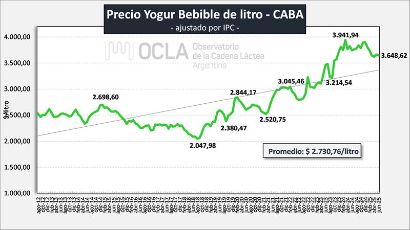 La situación de los yogures bebibles de litro, en principio es diferente, ya que sostienen el nivel de consumo de la categoría, y sus precios se venían ajustan por encima del ritmo inflacionario, con algunos altibajos. El precio actual está 33,6% por encima de la media de la serie. Lamentablemente tiran para abajo el promedio del mix, ya que su aumento de ventas no fue acompañado por las ventas de yogures en pote, postres y flanes que tienen un mayor valor por litro equivalente.
