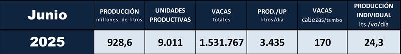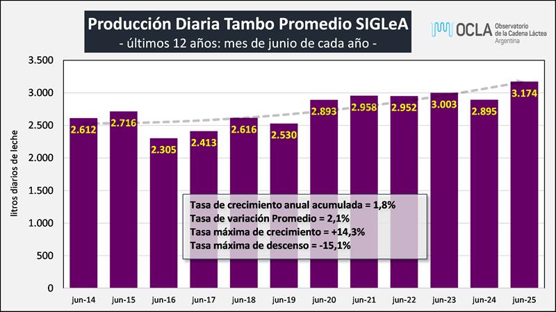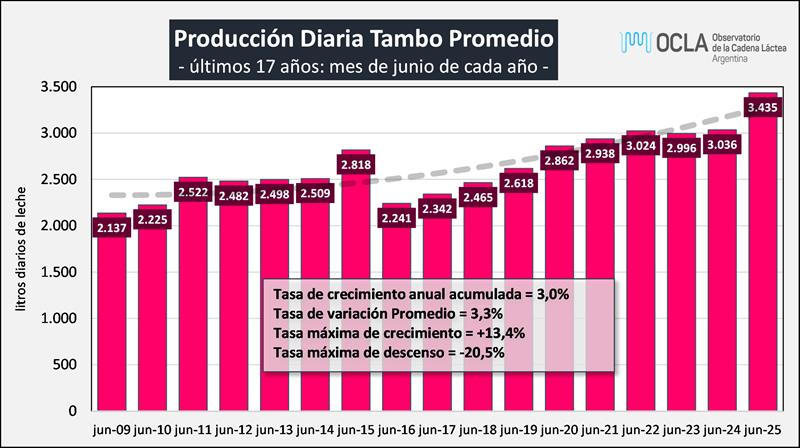 Sobre la base de la producción mensual y la cantidad de tambos que indica el Tablero Dinámico de SENASA, podemos inferir el tamaño del tambo promedio, unos 3.435 litros de leche diarios para junio de 2025, una producción superior al año anterior (+13,1%). En el período 2016-2025 el tambo promedio creció a una tasa del 4,85% anual, situación que se vio interrumpida en 2024 por diferentes factores, fundamentalmente por sequía y menos vacas en producción.