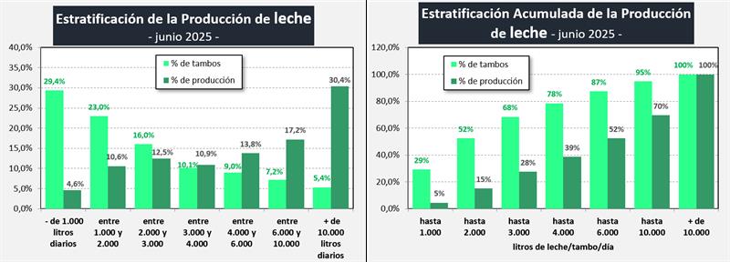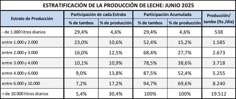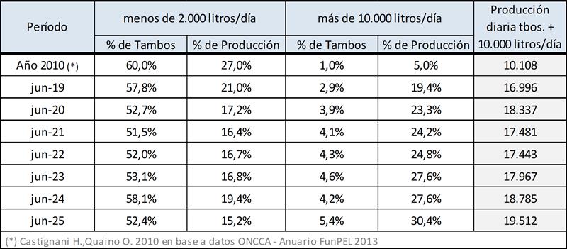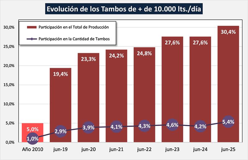 Entre 2010 y 2025 los tambos de menos de 2.000 litros de producción diaria venían reduciendo significativamente su importancia relativa en la producción de leche total y los tambos de más de 10.000 litros diarios de producción, multiplicaron por 6 su participación en la producción, a pesar del efecto de caída de la producción total que se dio en 2024.