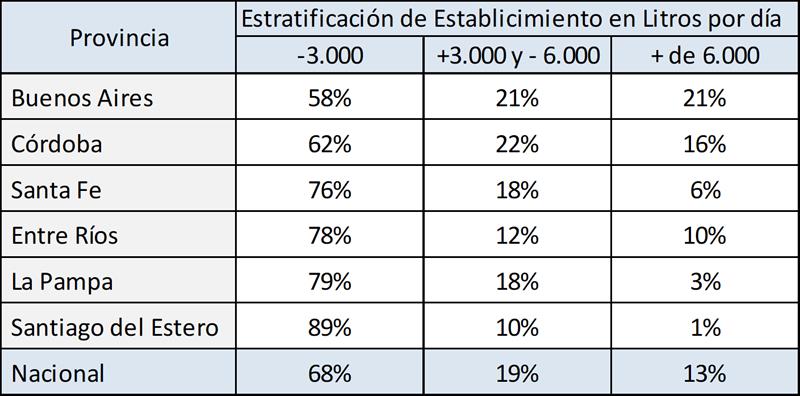 Puede verse en el cuadro siguiente al comparar con datos disponibles del año 2010, que en un extremo viene disminuyendo la participación tanto en cantidad de tambos como en el volumen de producción de las unidades productivas de menos de 2.000 litros diarios y en el otro extremo de la estratificación, se incrementa la participación de las unidades de más de 10.000 litros diarios.