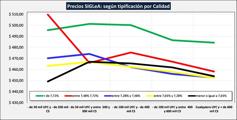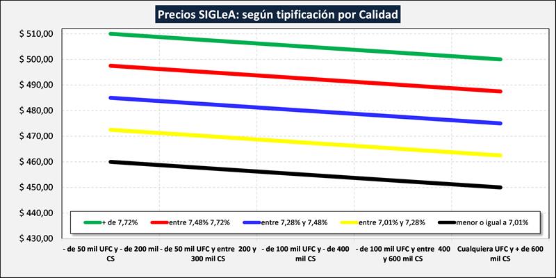 Variabilidad de Precios SIGLeA – JUNIO 2025 23/7/2025![]() Los precios publicados surgen del promedio del precio básico + bonificaciones de calidad por estrato + el promedio de bonificaciones comerciales ponderados por litro. Los parámetros higiénicos y sanitarios son fijos mes a mes y los parámetros composicionales para definir cada rango variarán por mes en función a la estructura composicional (grasa butirosa + proteína). En el cuadro de tipificación, la leche comercializada se divide en 25 estratos según composición y calidad higiénico-sanitaria y, dentro de cada estrato, se muestra un promedio ponderado del precio del total de esos litros y además un promedio ponderado del 20% superior e inferior de los precios. Cabe también mencionar que tanto en el precio SIGLeA como Panel 18 no se ven reflejados las notas de créditos (ajustes posteriores a la liquidación), y como siempre las subfacturaciones que ocurren con algunos pagos que se realizan por algunas industrias fuera de la liquidación de carácter legal. ![]() En el gráfico de arriba se presentan en 5 curvas por Tipo de leche en función a los sólidos útiles (grasa butirosa + proteína), los diferentes precios en función a la calidad higiénico-sanitaria (UFC/ml y RCS/ml). Se puede observar que existen precios descendentes en cada tipo composicional a medida que desmejora la calidad higiénico-sanitaria, pero se dan algunos serruchos ya que las “penalizaciones” por menor calidad se ven compensadas seguramente por la presencia de bonificaciones comerciales que pueden estar especificadas y tabuladas (ejemplo: volumen, temperatura, distancia, permanencia, etc.) o arbitrarias en función a aspectos no especificados en los Sistemas de Tipificación y Pago de la Leche (netamente comerciales). Para tratar de hacer más clara la interpretación del gráfico superior, se incluye abajo lo que podría ser una situación basada exclusivamente en la proporcionalidad de los atributos de la calidad integral de la leche y sin tener en cuenta aspectos ajenos a ella. ![]() Si elaboramos una nube de puntos con los diferentes precios disponibles en función a las calidades, podemos observar que se da una pendiente descendente de precios a medida que es menor la calidad integral de la leche, pero esa pendiente podría ser mucho más pronunciada si se pretende incentivar la mejor calidad de leche. ![]() Resolución N° 229/16 Considerandos: “es deseable que el precio total obtenido y facturado por la leche entregada, se conforme de modo que los atributos guarden entre sí la relación de un OCHENTA POR CIENTO (80%) de ponderación mínima de atributos de calidad composicional e higiénico-sanitarios y de un máximo de VEINTE POR CIENTO (20%) para bonificaciones comerciales u otras, como una forma de privilegiar los atributos de calidad y composición por sobre otros factores. Que, alineado con este objetivo, es deseable que los atributos de calidad composicional e higiénico-sanitarios guarden entre sí la relación de un máximo de SESENTA POR CIENTO (60%) para los primeros y de un mínimo de CUARENTA POR CIENTO (40%) para los segundos”. Conformación del Precio: CALIDAD: 80 % mínimo. Calidad Composicional: 60%, 48% del Total Liquidado Calidad Higiénico-Sanitaria: 40%, 32% del Total Liquidado COMERCIALES: 20% máximo. Liquidación: junio 2025 – SIGLeA (análisis OCLA) $ 2.981,16/kg. de Grasa Butirosa Básico x 3,94% de GB = $ 117,46/litro $ 4.534,83/kg. de Proteína Básico x 3,57% de Proteína = $ 161,89/litro Total Liquidado por Calidad Composicional = $ 279,35/litro Sobre un Precio Final de $ 472,87/litro, la Calidad Composicional incide en un 59,1% elaborado por el OCLA con información de la DNL-SAGyP