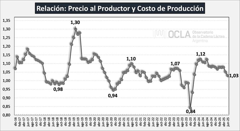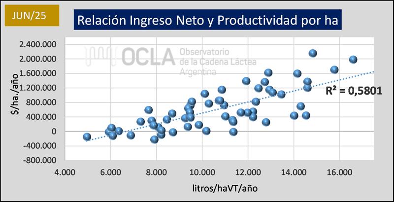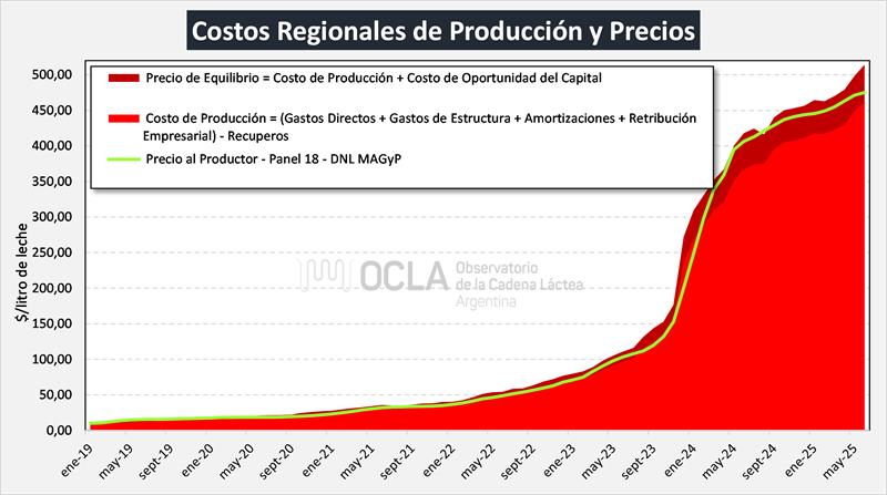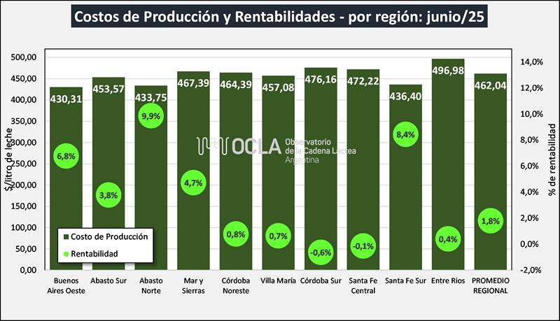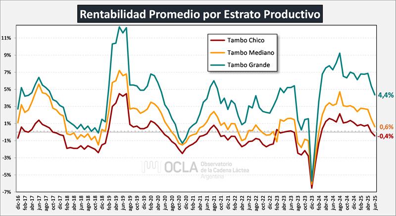 Costos Regionales de Producción de Leche, valores actualizados a JUNIO del 2025 25/7/2025![]() Precio al Productor: en base al precio por provincia de DNL – MAGyP (SIGLeA-LUME), calidad y volumen de cada tambo en los 30 modelos regionales. Costo de Producción: (Gastos Directos + Gastos de Estructura + Amortizaciones + Retribución Empresarial) – Recuperos (venta y/o cesión de terneros, y vacas y toros de rechazo). Precio de Equilibrio: Costo de Producción + Costo de Oportunidad al Capital (5%). También se los denomina Costo de Producción de Largo Plazo. Ingreso al Capital: (Ingreso por Leche + Ingreso por Carne) - (Gastos Directos + Gastos de Estructura + Amortizaciones +Retribución Empresarial). Rentabilidad: (Ingreso al Capital / Capital) x 100 ![]() Los Costos Regionales elaborados por INTA y actualizados todos los meses, se realizan para 10 regiones productivas (las comprendidas en el mapa superior) y se calculan para el Caso Modal (modelo promedio regional) y para el Decil Superior (10% superior en productividad), y en ambos casos para tres estratos: Chico, Mediano y Grande. Por lo tanto, surgen 60 costos de los cuales, para el cálculo promedio, en OCLA sólo utilizamos los 30 costos surgidos del Análisis del Caso Modal sin incluir el Decil Superior. ![]() Como lo veníamos informando en oportunidades anteriores se había producido un fuerte desacople en diciembre 2023 (por la devaluación y la alta inflación), entre precios y costos y señalábamos que los precios de la leche venían creciendo por encima de la inflación y que pronto se produciría la convergencia, es por ello que ya en febrero de 2024 se puede observar una tasa de rentabilidad positiva que luego entre marzo 2024 y abril de 2025 se mantiene entorno al 4% con un pico de 5,8% en agosto de 2024. Ahora en junio próximo pasado la tasa de rentabilidad cae al 1,8% y cae un poco la tasa de los 12 meses al 3,8%. Si desagregamos la rentabilidad promedio y la graficamos para los estratos grande, mediano y chico vemos que la evolución de la rentabilidad de los tambos grandes siempre está por arriba (incluso por momentos, considerablemente) de los tambos medianos y chicos. Esto nos permite deducir que las mayores escalas de producción, que normalmente vienen acompañadas de mayor y mejor usos de tecnologías de insumos y procesos, también conducen a mayor productividad y eficiencia que se ve reflejada en los resultados económicos obtenidos. Cabe sí mencionar que, en el caso de los denominados tambos chicos, que tienen un promedio de producción diaria de 1.761 litros en los modelos de INTA, para junio arrojan una tasa de rentabilidad negativa del 0,4%, por lo que el costo de producción se encuentra levemente por encima del precio percibido y los tambos más grandes (8.830 litros por día) casi logran la tasa exigida de 5% al Capital Promedio Operado (4,4%). ![]() Como indicamos más arriba, la tasa de rentabilidad promedio (Ingreso Neto / Capital Promedio Operado) fue del 3,8% en los últimos 12 meses (positiva en los últimos 17 meses), muy cercana a la tasa exigida en el Precio de Equilibrio que contempla el Costo de Oportunidad del Capital Invertido (5%), y muy por encima de la tasa de los últimos años. Se puede decir que, en los últimos 17 meses, se logró el precio de equilibrio si se adicionan los diferenciales de precio que se generan con las notas de crédito post liquidación y pagos por fuera de las liquidaciones que cubren todos los aspectos impositivos. El gráfico de abajo muestra la evolución del precio (línea verde) sobre las áreas de costo (rojo) y sobre la del precio de equilibrio o costo de largo plazo (bordo) y vemos como en los últimos meses el precio supera holgadamente el costo y se acerca al precio de equilibrio, superándolo en agosto próximo pasado. ![]() El tambo promedio SIGLeA-LUME que en junio de 2025 tuvo una producción diaria de 3.174 litros, facturó un 8,1% por debajo del año anterior. En el acumulado del primer semestre medido en moneda constante facturó un 1,3% por debajo de igual período del año anterior debido a una baja en el precio de 12,2% pero con una mejora de producción del 12,4%. El gráfico siguiente muestra la relación entre el precio percibido y el costo de producción, que cuando el factor supera 1 el precio es superior al costo. Esta relación es positiva en los últimos 17 meses, llegó 1,12 en mayo 2024 y en los últimos meses se mantenía en 1,08, cayendo a 1,03 en junio pasado, marcando desde el pico mencionado una tendencia al decrecimiento y muy cerca de la relación de equilibrio. ![]() El Costo de Producción Promedio de $ 462,04/lt. y la Rentabilidad Promedio de 1,8%, surgen de los promedios ponderados de las 10 regiones mencionadas y para los tres estratos considerados. En el gráfico de abajo se puede observar el costo y la rentabilidad de cada región productiva, mostrando claramente la gran dispersión, muy vinculada con las diferentes escalas y productividades. ![]() Por último, incorporamos el gráfico donde se obtiene la mayor correlación entre las variables económicas y productivas, en este caso la relación entre el Ingreso Neto y la Productividad (medida en litros de leche por hectárea por año). ![]() Ver informe de facturación: https://www.ocla.org.ar/noticias/33800769-facturacion-del-tambo-promedio-junio-2025 elaborado por el OCLA sobre la publicación de Costos Regionales de Producción - INTA