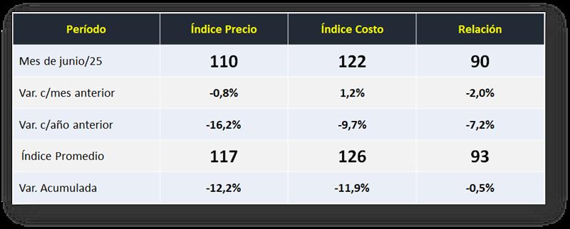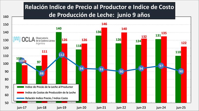 Relación Indice Precio e Indice Costo de Producción: junio 2025 25/7/2025![]() Criterio Metodológico Se calcula el Indice de Precios de la Leche al Productor, sobre precios actualizados por IPC y se referencian todos los precios mensuales a enero 2017 = 100. Se calcula el Indice de Costos de Producción de Leche, actualizado por IPC y se referencian todos los costos mensuales a enero 2017 = 100. Se calcula la relación dividiendo el Indice de Precios de la Leche al Productor con el Indice de Costos de Producción de Leche. Frecuencia Se calcula todos los meses y el período elegido surge en virtud que es desde enero 2017 que disponemos de los Costos Regionales de Producción. Comentarios Los precios índices o un índice de precios, permite visualizar los cambios que ocurren en los precios de la variable analizada en relación al período de referencia. Por lo tanto, estos índices y su relación nos permiten comparar cómo evoluciona cada uno de los tres índices respecto a su base inicial o respecto a otros períodos anteriores: mes anterior, igual mes del año anterior, acumulado anual. ![]() Debido al fuerte y constante proceso inflacionario se decidió para homogeneizar la comparación de los precios y costos, llevarlos al momento actual mediante su actualización utilizando el Índice de Precios al Consumidor (IPC). En junio de 2025 se cae el índice precio y sube el índice costo lo que hace caer la relación a un valor 90, -2,0% respecto al mes anterior, en el interanual cae 7,2%. En el acumulado del primer semestre del año hay una baja del 0,5% respecto a igual período del año anterior. Como ya lo indicamos en el informe de costos, los precios se vienen ajustando por debajo de la inflación, pero una situación similar venía ocurriendo con los principales costos, lo cual mantenía favorables aún las relaciones de precios. De continuar esta leve pero consecutiva desmejora de los precios respecto a los costos, las relaciones pueden comenzar a tornarse desfavorables. Es muy importante que siga recuperándose el consumo doméstico y que mejore la situación cambiaria en el mercado de exportación, sobre todo dado el crecimiento de la producción en términos interanuales y la ida hacia el pico de máxima producción (octubre). Estacionalidad Se compara el Indice de Precios, de Costos y la Relación entre ambos para el mismo mes de la serie de 9 años. ![]() Fuente Precio de la Leche al Productor: Precio Panel 18 DNL-SAGyP. Costo de Producción: Costo Promedio de los Costos Regionales de Producción de Leche - INTA. Actualización: Indice de Precio al Consumidor - INDEC. elaborado por el OCLA