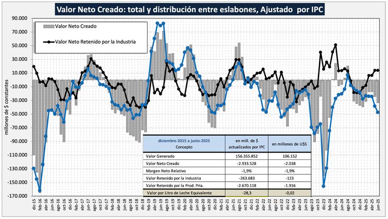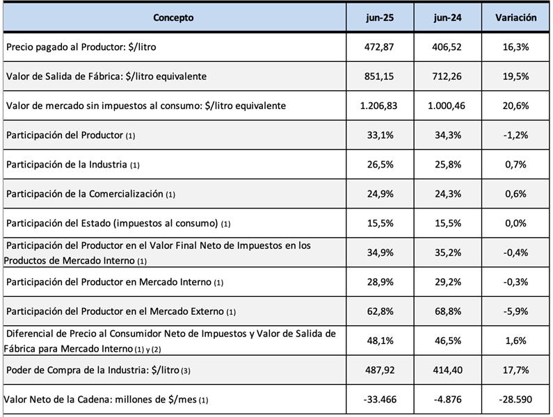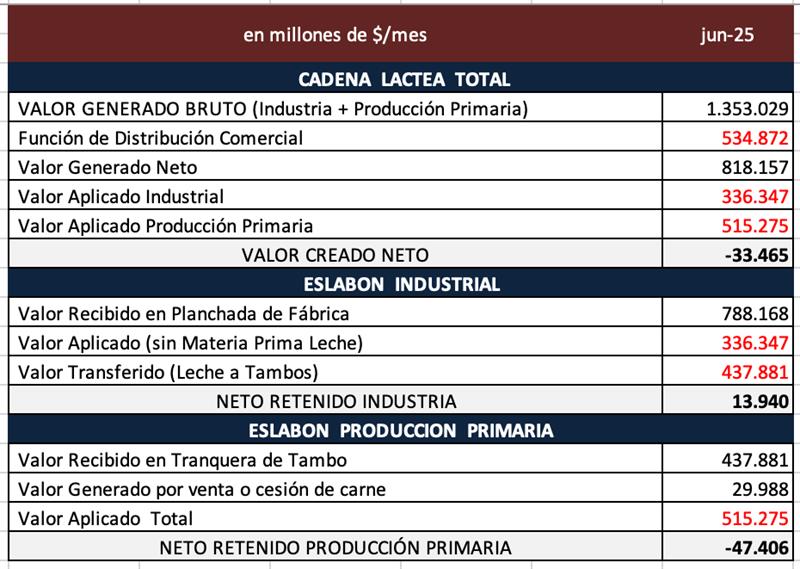 La cadena presenta un resultado negativo en junio de 2025 de $ 33.465 millones (3,05 centavos de dólar por litro de leche equivalente). El sector industrial tiene un resultado estimado positivo de $ 13.940 millones (US$ 11,8 M) y el sector primario tiene un resultado negativo de $ 47.406 millones. (- US$ 40,1 M).