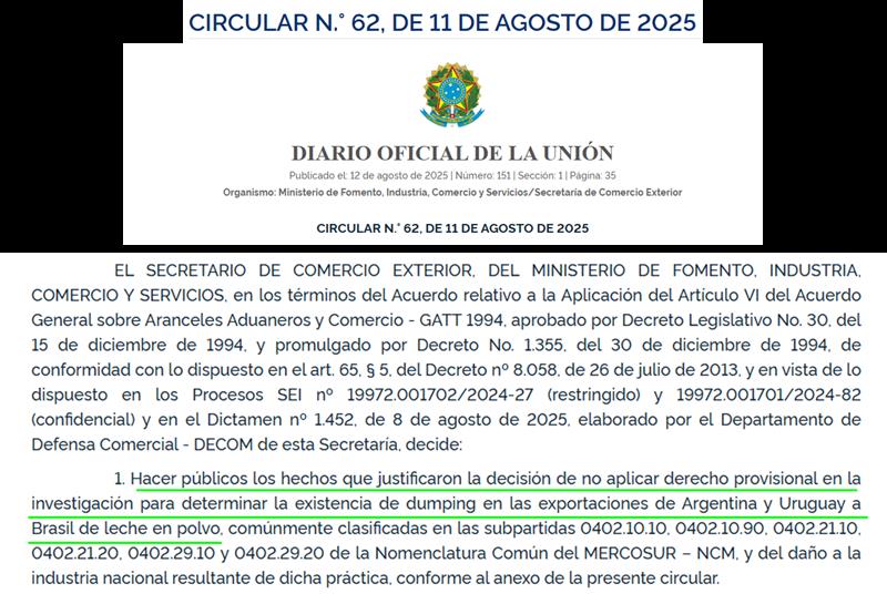 Antidumping de Brasil sobre Leche en Polvo de Argentina 13/8/2025
