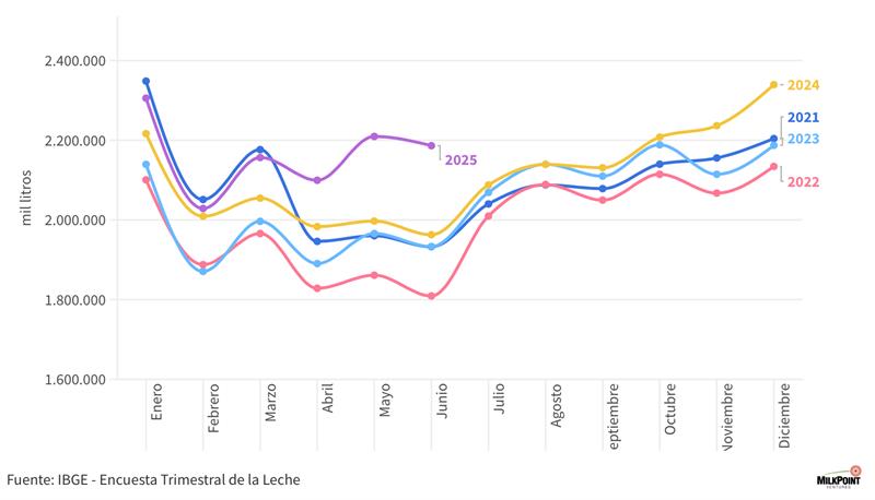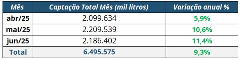 Según datos preliminares de la Encuesta Trimestral de Leche del IBGE, la captación formal de leche en Brasil alcanzó los 6.500 millones de litros en el segundo trimestre de 2025, un aumento del 9,3% en el promedio trimestral en comparación con el mismo período de 2024