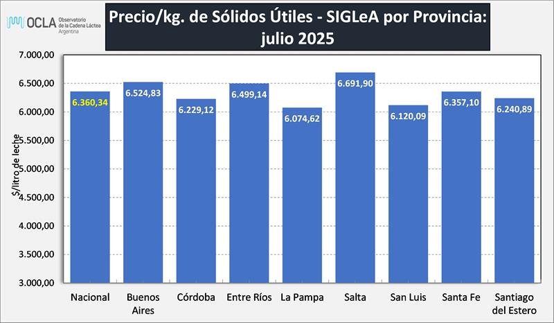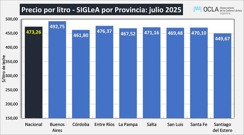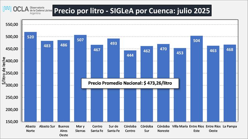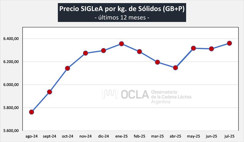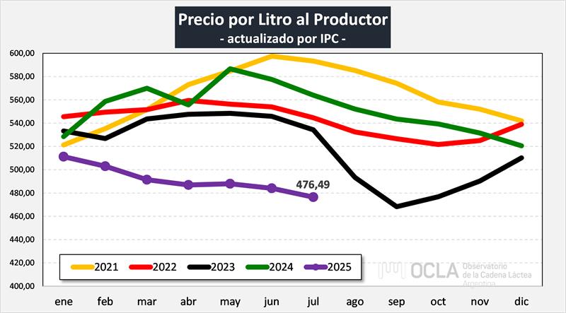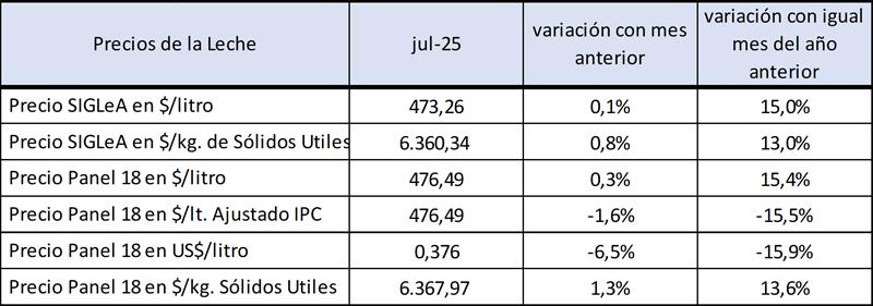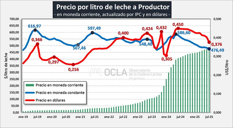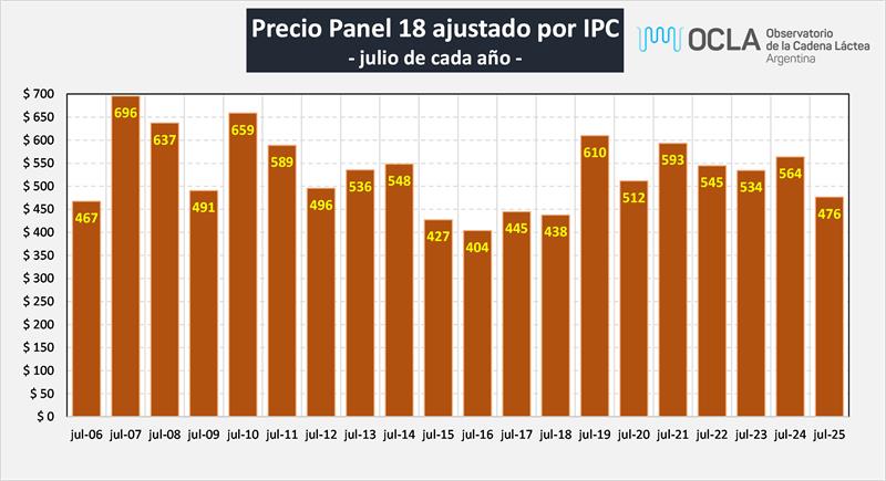 Precios de la leche al productor: julio de 2025 14/8/2025![]() Observaciones: El precio SIGLeA en US$ que publica la DNL surge al convertir el precio en $ al dólar Tipo de Cambio Vendedor Banco Nación Argentina (BNA) del último día del mes (US$ 0,34/litro). OCLA utiliza para su conversión el precio el Tipo de Cambio de Referencia Comunicación A 3500 Mayorista Promedio Mensual – TCNPM $ 1.267,02 lo cual implica un precio de US$ 0,374/litro. OCLA utiliza el precio Panel 18 Empresas ya que es el que continúa la serie histórica y puede estar menos influenciado por valores no incluidos en la liquidación de leche. Respecto al precio de los sólidos (grasa butirosa y proteína), no solo venía cayendo en moneda constante, sino que también entre febrero y abril cayeron en moneda corriente debido a que los precios no acompañaron la importante suba de sólidos, en mayo próximo pasado la suba en el precio por litro, acompañada de una baja en los contenidos de grasa butirosa y proteína, hicieron que el precio por Kg. de Sólidos utilizados para la liquidación, subiera tanto en moneda corriente como en moneda constante, y ahora se mantuvo prácticamente igual en junio respecto a mayo y sube algo en julio. ![]() Cabe también mencionar que tanto en el precio SIGLeA como Panel 18 no se ven reflejados las notas de créditos posteriores a la liquidación, ni tampoco las conocidas subfacturaciones que ocurren con algunos pagos que se realizan por algunas industrias fuera de la liquidación de carácter legal. Consultados varios grupos de comercialización, nos indicaron que hubo muchos ajustes por notas de débito que no figuran en el precio promedio SIGLeA. La complejidad de nuestra economía con alta inflación y diferentes tipos de cambio con amplias brechas entre ellos, hacía muy compleja la presentación de la información. La mayor estabilidad inflacionaria y cambiaria, deja sólo como difícil de visibilizar en la evolución de precios, los pagos extra liquidación dentro de la órbita impositiva y sobre todo los que están fuera de ella. Nosotros les presentamos la información que disponemos y consideramos que puede resultar de utilidad como herramienta para la toma de decisiones y cada usuario decide cual le resulta más apropiada para su análisis. ![]() El gráfico de arriba resume el precio Panel 18 por litro de leche en sus tres versiones, en moneda corriente, en moneda constante (ajustado por IPC) y en dólares (dólar mayorista BCRA). ![]() En una visión de más corto plazo el gráfico anterior muestra el precio por litro de leche actualizado a junio 2025 por inflación y que los precios de febrero, marzo y mayo de 2024 habían sido los más altos de los últimos 5 años, y qué en los últimos siete meses de 2024, fueron inferiores al año 2021 y los precios de los primeros siete meses de 2025 son los más bajos de los últimos 5 años para esos meses. Viendo exclusivamente el precio de los meses de julio de los últimos 20 años, julio de 2025 tuvo por encima 15 años y es el más bajo de los últimos 7 años. ![]() A continuación, se puede ver el Precio SIGLeA por litro de leche y por kg. de Sólidos Útiles (Grasa Butirosa + Proteína) discriminado por Provincia y por Cuenca Lechera. ![]() ![]() ![]() elaborado por el OCLA con información de la DNL – SAGyP