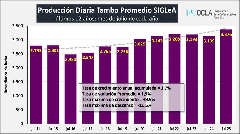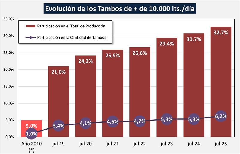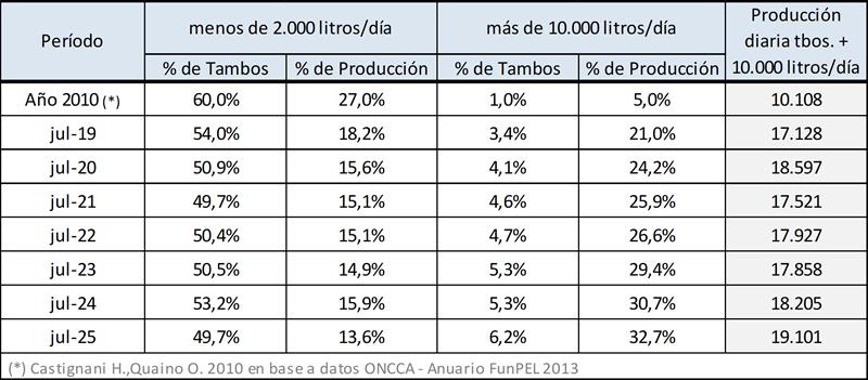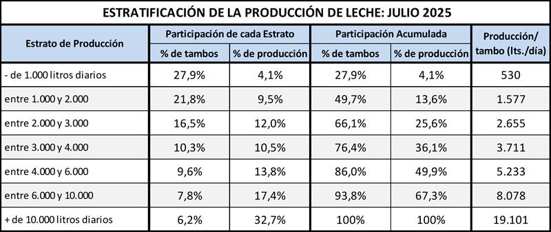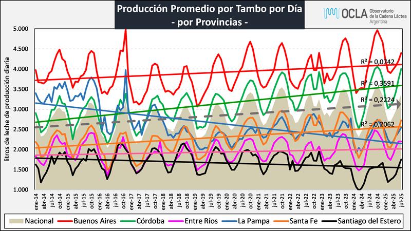 Estructura de la producción primaria – julio 2025 18/8/2025![]() Estratificación de Tambos En el cuadro se presenta la participación de los tambos en función a su tamaño medido en litros de leche diarios del mes de julio de 2025 sobre la base SIGLeA - LUME: ![]() Sobre la base de la estratificación de SIGLeA y la cantidad de tambos según el Tablero Dinámico de SENASA, se puede observarse que los 558 tambos del estrato de + de 10.000 litros de producción diaria, produjeron durante el mes de julio un promedio de 19.101 litros diarios, representaron el 6,2% del total de tambos y aportaron un 32,7% de la producción total. Esto es bastante más de lo que aportaron los 4.474 tambos de menos de 2.000 litros diarios y que fueron el 49,7% de los tambos totales, y que representaron el 13,6% de la producción nacional. ![]() Concentración en unidades productivas más grandes Puede verse en el cuadro siguiente al comparar con datos disponibles del año 2010, que en un extremo viene disminuyendo la participación tanto en cantidad de tambos como en el volumen de producción de las unidades productivas de menos de 2.000 litros diarios y en el otro extremo de la estratificación, se incrementa la participación de las unidades de más de 10.000 litros diarios. Entre 2010 y 2025 los tambos de menos de 2.000 litros de producción diaria venían reduciendo significativamente su importancia relativa en la producción de leche total y los tambos de más de 10.000 litros diarios de producción, multiplicaron por 6 su participación en la producción y la cantidad de tambos, a pesar del efecto de caída de la producción total que se dio en 2024. ![]() En una a representación gráfica se puede observar de forma más contundente el crecimiento en participación de los tambos de + de 10.000 litros diarios de producción de leche: ![]() Como mencionamos arriba, se están reduciendo la cantidad de tambos como lo venimos indicando desde el inicio de nuestras publicaciones, y en base a la información disponible podemos deducir que la mayor reducción no se da mayoritariamente en los tambos más chicos (con una característica mayor de producción familiar y ubicados muchos de ellos en cuencas no tradicionales), sino en aquellos que superaron un volumen de 2.000 litros diarios, pero no llegan a convertirse en tambos de mayor escala por diferentes motivos: sucesión familiar, superficie, acceso al financiamiento, incorporación de tecnologías de insumos y procesos, etc. Por su parte, en el gráfico siguientes se puede ver la distribución de los tambos por provincia en base a su tamaño, y se puede concluir que los tambos más grandes están principalmente en Buenos Aires, seguido por Córdoba y el resto de provincia se caracteriza por una prevalencia de tambos de menos de 3.000 litros diarios. ![]() El Tambo Promedio Mensual Sobre la base de la producción mensual y la cantidad de tambos que indica el Tablero Dinámico de SENASA, podemos inferir el tamaño del tambo promedio, unos 3.630 litros de leche diarios para julio de 2025, una producción superior al año anterior (+10,5%). En el período 2016-2025 el tambo promedio creció a una tasa del 4,94% anual, situación que se vio casi interrumpida en 2024 por diferentes factores, fundamentalmente por sequía y menos vacas en producción. ![]() La serie de cantidad anual de tambos y el tablero dinámico, ambos de SENASA, utilizados para los cálculos de la producción por tambo, es la única disponible y a pesar de conocer algunas falencias en el relevamiento de la información, el criterio se mantiene en el tiempo y nos permite evaluar la tendencia. En caso de existir una fuente de información mejor, obviamente no proveniente de estimaciones o supuestos, la incorporaremos en nuestro análisis. El Tambo Promedio SIGLeA – LUME, producción diaria al mes de julio de cada año: ![]() En el gráfico de arriba se compara la evolución del tambo promedio mensual que se publica con la información surgida del SIGLeA – LUME en el Tablero de Comando Sectorial 2° Parte. El Tambo Promedio por Provincia SIGLeA – LUME, producción diaria últimos 12 meses ![]() La producción promedio diaria por tambo y por provincia que graficamos aquí es la que arrojan los datos de SIGLeA – LUME y se toma el promedio de los últimos 12 meses (agosto/24 – julio/25). Los datos SIGLeA – LUME del último mes provienen de 7.576 liquidaciones, 377 industrias lácteas. Por último, en el gráfico de abajo se muestra la tendencia en la evolución del tambo promedio nacional y por provincia, donde hay provincias como Córdoba con una importante tendencia al crecimiento (mayo R cuadrado), en la producción de sus unidades productivas, seguida por Santa Fe y Buenos Aires, y luego el resto con una tendencia estable y un solo caso negativa. ![]() Todos estos gráficos y más en: https://www.ocla.org.ar/contents/newschart/portfolio/?categoryid=17 – elaborado por el OCLA sobre información de la DNL-SAGyP y SENASA