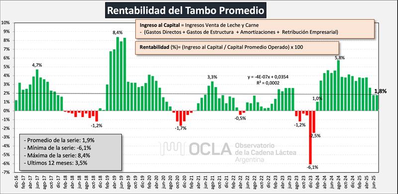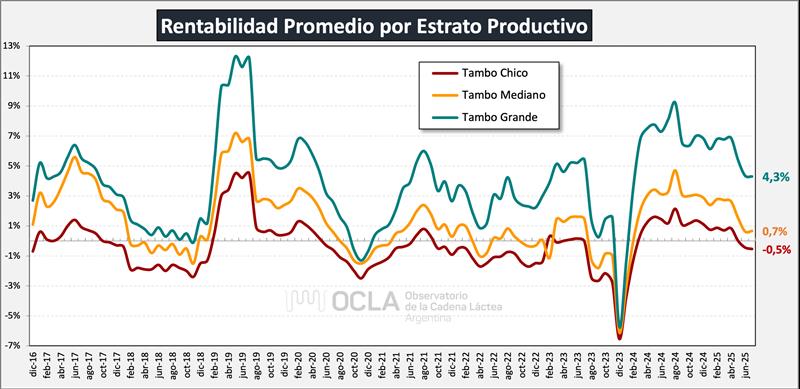 Cabe sí mencionar que, en el caso de los denominados tambos chicos, que tienen un promedio de producción diaria de 1.761 litros en los modelos de INTA, para julio arrojan una tasa de rentabilidad negativa del 0,5%, por lo que el costo de producción se encuentra levemente por encima del precio percibido y los tambos más grandes (8.830 litros por día) casi logran la tasa exigida de 5% al Capital Promedio Operado (4,3%).