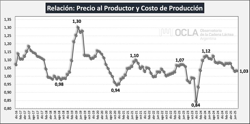 El gráfico siguiente muestra la relación entre el precio percibido y el costo de producción, que cuando el factor supera 1 el precio es superior al costo. Esta relación es positiva en los últimos 17 meses, llegó 1,12 en mayo 2024 y en los últimos meses se mantenía en 1,08, cayendo a 1,03 en junio pasado, manteniendo igual en julio, marcando desde el pico mencionado una tendencia al decrecimiento y muy cerca de la relación de equilibrio.