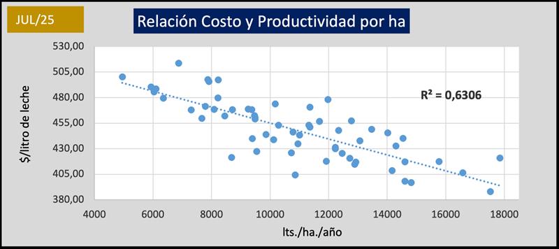 Por último, incorporamos el gráfico donde se obtiene la mayor correlación entre las variables económicas y productivas, en este caso la relación entre el Costo y la Productividad (medida en litros de leche por hectárea por año).