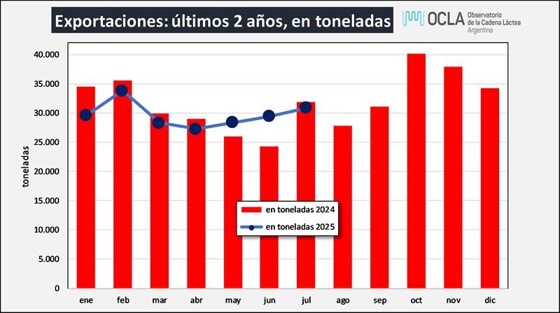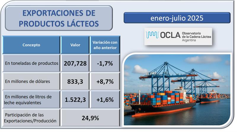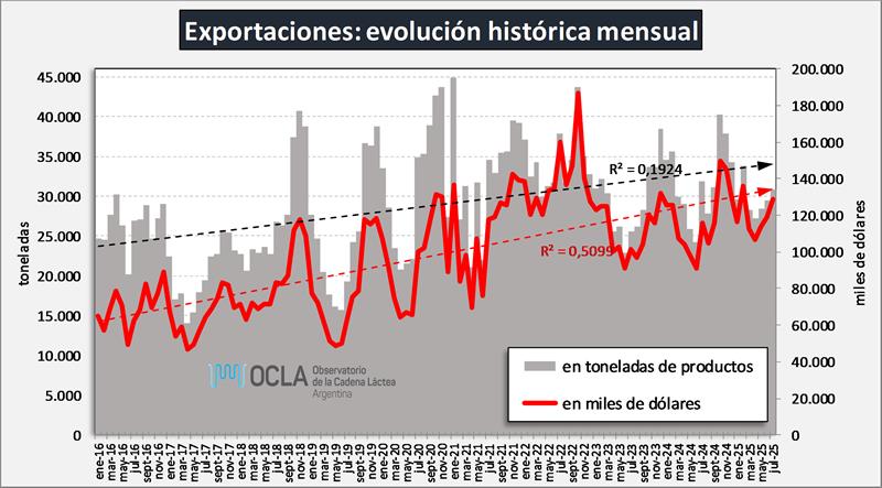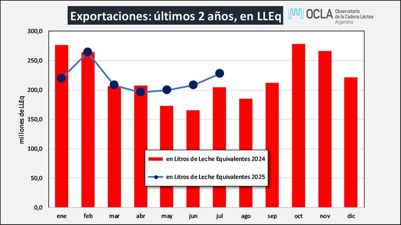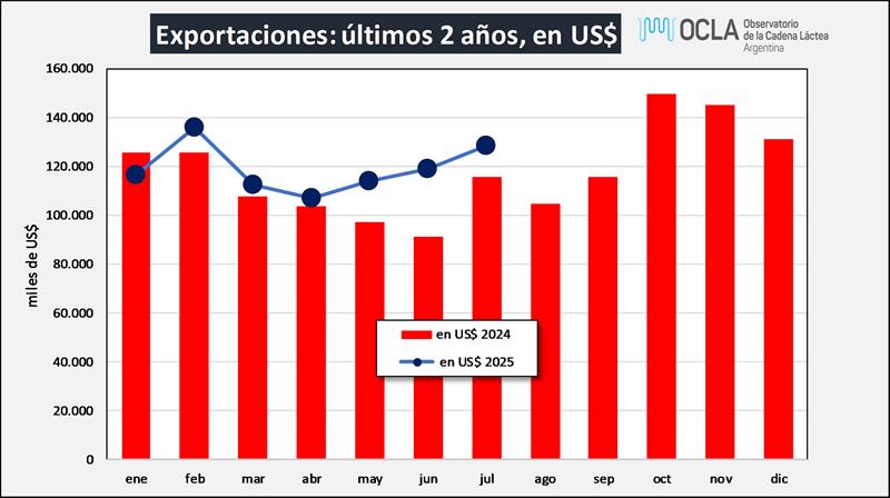 Las exportaciones de productos lácteos en julio de 2025 totalizaron 30.858 toneladas de productos, por un valor de US$ 128,5 millones, subieron 4,7%, y 8,0% en volumen de productos, y en monto total en dólares, respectivamente, comparadas con el mes anterior. En litros de leche equivalentes alcanzaron los 227,5 millones de litros, mejorando un 9,5%.