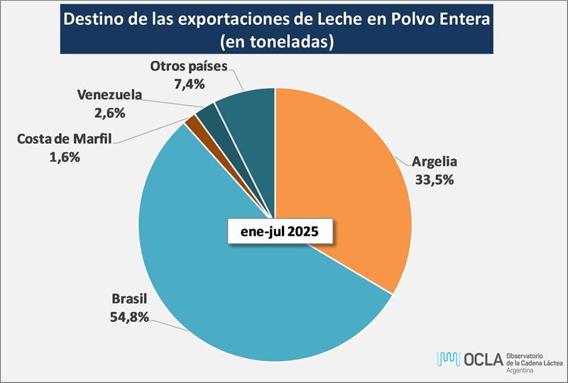 En enero-julio se dio una participación de Brasil del 54,8% y de Argelia del 33,5% para Leche en Polvo Entera, siendo ambos los principales destinos habituales de exportación de nuestro productor más significativo en las exportaciones.