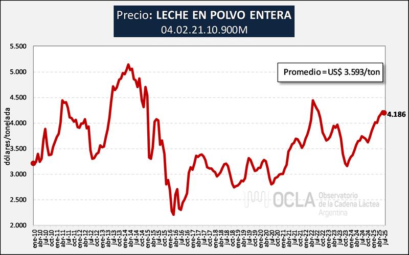 En el gráfico siguiente se puede observar la evolución del precio de la Leche en Polvo Entera en bolsas de 25 kgs. con el nomenclador Común Arancelario 04.02.21.10 900M actualizado hasta el mes de julio de 2025: