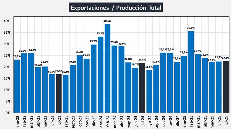 En litros de leche equivalentes a julio de 2025, fueron levemente superiores (+1,6%) en el interanual y representaron el 24,9% de la producción total (en ene-jul de 2024 representaron el 27,2%).