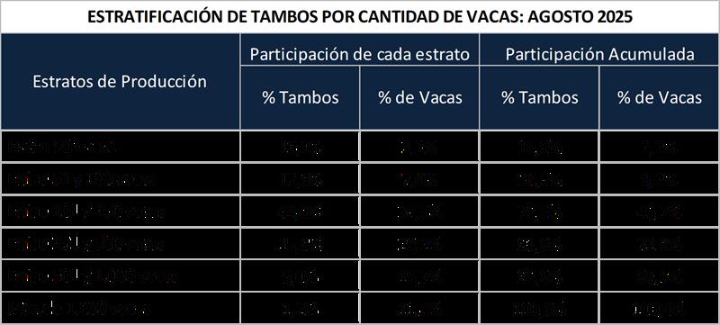 Abajo la estratificación en función a la cantidad de vacas, indicando la participación en función a la cantidad de tambos y luego de animales en producción. Como más significativo puede mencionarse que los tambos con más de 500 vacas totales en producción son sólo el 6,2% de los tambos, pero tienen el 27,1% de las vacas y aportan más de un tercio de la producción total de leche. En el otro extremo se encuentran los tambos de menos de 100 vacas totales en producción que son el 34,5% de los tambos, tienen el 9,2% de las vacas y generan menos del 10% de la producción total.
