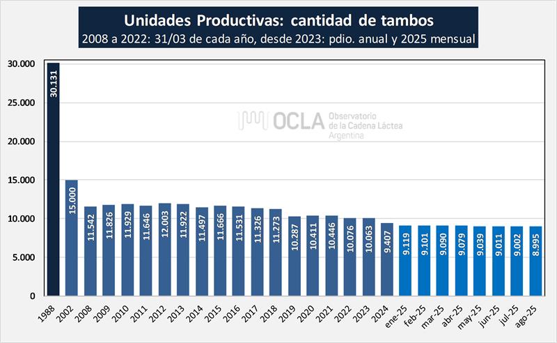 El año 2025 inició con 9.129 unidades productivas de las cuales en agosto se registran 8.995, ello implica 134 tambos menos que si lo extrapolamos al año significaría un 2,20% menos, tasa levemente inferior a la observada en los últimos 10 años (-2,4% promedio anual).