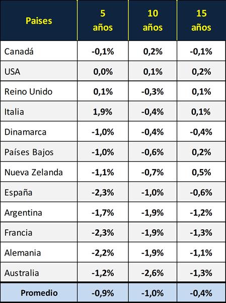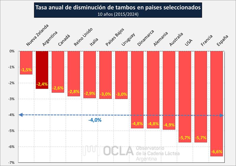 En el gráfico y cuadro siguiente, sobre la base de la cantidad de unidades productivas de los últimos 15 años, se calcula la tasa anual para el período de 5, 10 y 15 años respectivamente, donde se puede observar el promedio simple de la tasa de disminución de tambos de los países disponibles que asciende al 4,0% anual en los últimos 10 años.