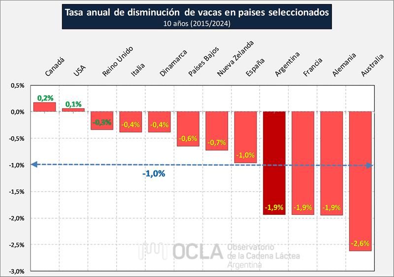 De los dos componentes que determinan el volumen de producción, la cantidad de vacas y la producción individual por vaca, hemos analizado el primero de ellos y vemos que también en una serie histórica de 15 años para un grupo de países seleccionados, la tasa de variación anual es negativa y está en torno al 1%. Argentina en este aspecto se encuentra por encima de la media.
