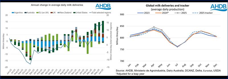 La producción en Estados Unidos aumentó un 3,3% interanual, alcanzando los 282,5 millones de litros diarios en junio. Los análisis del mercado sugieren que tanto el aumento del tamaño del rodeo lechero como la mejora de los márgenes han sido los motores del crecimiento. Australia registró una disminución interanual en la producción, con entregas inferiores en 1 millón de litros diarios (-5,2%) en comparación con el año pasado, hasta situarse en un promedio de 18,8 millones de litros diarios. Las condiciones climáticas secas en el suroeste de Australia han reducido la producción.