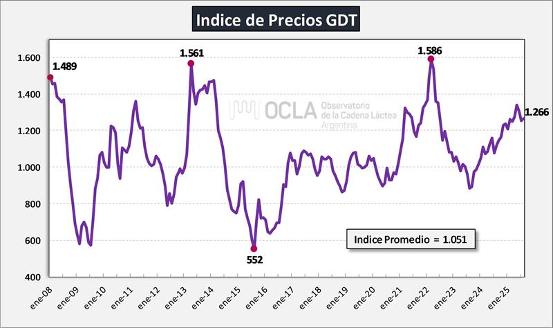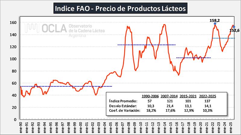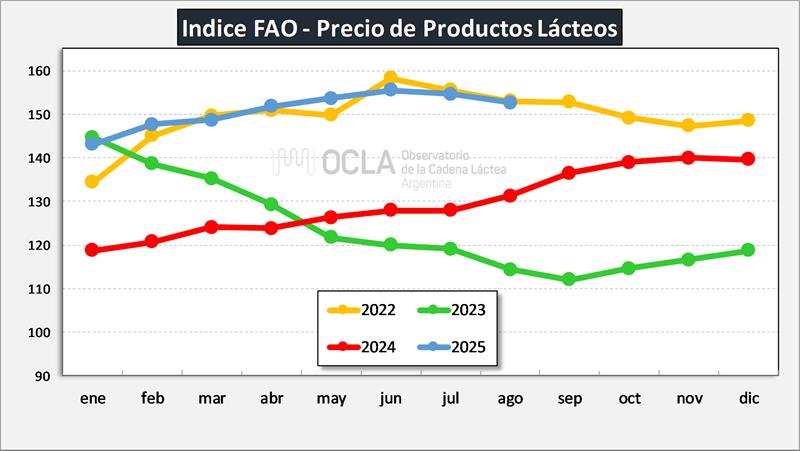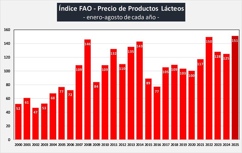 Indice de Precios de los Lácteos de FAO 5/9/2025![]() El índice de precios de los productos lácteos de la FAO se situó en agosto de 2025 en un promedio de 152,6 puntos, esto es, 1,3 puntos menos que en julio, lo que representa su segundo descenso mensual consecutivo, pero aun así se mantiene 16,2 puntos por encima de su nivel de hace un año. El descenso obedeció a la bajada de los precios internacionales de la manteca, el queso y la leche entera en polvo, que contrarrestó la subida de las cotizaciones de la leche en polvo descremada. Los precios de la manteca disminuyeron un 2,5 % en agosto, ya que la solidez de la producción en Nueva Zelandia —pese a la pausa estacional de la producción en el país— y la oferta constante de la UE impulsaron la disponibilidad mundial, mientras se mantuvo la atonía de la demanda de importaciones, en particular por parte de Asia. Los precios del queso disminuyeron un 1,8 %, revirtiendo los aumentos registrados desde abril, ya que la menor demanda de los principales mercados asiáticos y el descenso estacional de la actividad exportadora deprimieron los mercados de Oceanía, mientras que, en la UE, la disminución de la demanda interna durante la temporada de vacaciones y la mayor competencia de las exportaciones contribuyeron a la presión sobre los precios de este producto. Los precios de la leche en polvo descremada se redujeron un 0,3 %, a raíz de la escasa demanda de los principales países importadores. Por el contrario, los precios de la leche en polvo descremada subieron un 1,8 %, impulsados por los limitados excedentes exportables en Nueva Zelandia y la constante demanda de Asia sudoriental. ![]() ![]() En el gráfico de abajo podemos ver la evolución mensual del índice en los últimos cuatro años y el año pasado que comenzó muy por debajo de los anteriores, fue recuperando hasta casi alcanzar los valores de 2022 al final del año. Ahora en 2025 comenzó dentro de los valores más altos de los últimos 4 años, emparejándose luego con la curva de 2022 y presentando un leve descenso en los últimos dos meses. ![]() Por su parte el gráfico siguiente muestra el valor promedio de cada año del índice de precios de los lácteos de FAO de los últimos 26 años (2000-2025): En 2025 se dio el índice más alto de los últimos 26 años (151), seguido por 2022 (150) y muy de cerca por 2008 (146). De la serie disponible de 428 meses (1990-2025) del Índice de FAO sólo 8 meses estuvieron por encima del índice del mes pasado. ![]() Cabe acotar que los precios de FAO promedian varias commodities de dos mercados muy representativos. Por su parte el Índice del GDT de Nueva Zelanda presentó mejoras de precios a partir de septiembre 2023 con algunos altibajos, pero continuando una significativa tendencia positiva que llega a su máximo en mayo de 2025 y luego comienza a caer con una leve recuperación en agosto próximo pasado y precios futuros a la baja. ![]() elaborado por el OCLA con información de FAO